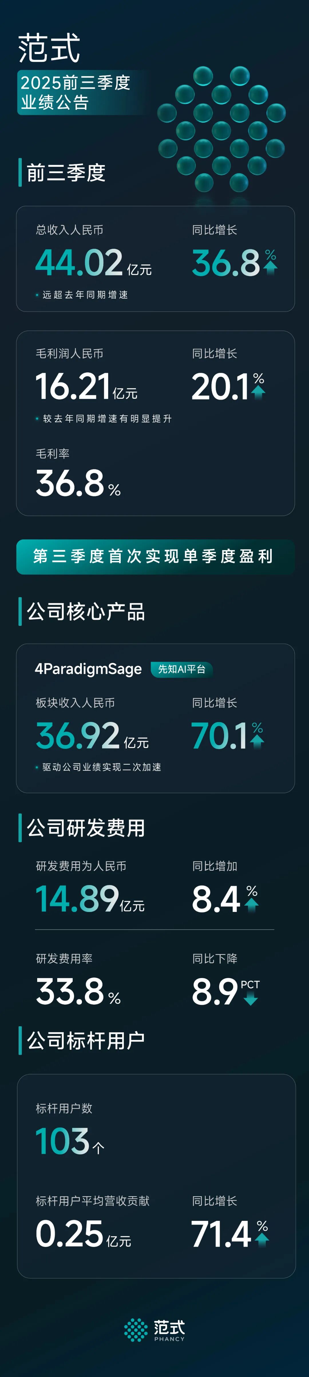 11月12日,范式发布2025年前三季度业绩公告。公告显示,今年前三季度,公司总收入人民币44.02亿元,同比增长36.8%,远超去年同期增速;毛利润人民币16.21亿元,同比增长20.1%,较去年同期增速有明显提升;毛利率为36.8%,期间内总体保持平稳,特别值得一提的是,公司在第三季度首次实现单季度盈利。随着企业客户对执行可落地、能够产生真实业务价值的AI应用需求愈发急迫,公司捕捉到大量新增业务机会,并在能源、制造、金融、零售等多个关键行业拓展了新客户。公司核心产品先知AI平台业务在公告期间实现爆发式增长,板块收入人民币36.92亿元,同比增长70.1%,驱动公司业绩实现二次加速。当然,这一强劲增长也离不开公司长期坚持在平台上探索并沉淀全栈式的AI技术及功能模块。本期间研发费用为人民币14.89亿元,同比增加8.4%,研发费用率为33.8%,同比下降8.9个百分点,在保持技术持续领先的同时,大幅优化研发投入产出效率。公告期间,公司深入投资发展国产算力——这一新时代的“石油”:一方面,公司投资持有国产领先GPU厂商曦望超过9%的股份,也通过公司旗下基金战略投资了另一家国产领先GPU厂商天数智芯;另一方面,针对产业空白,公司推出ModelHub XC及其底层核心的AI引擎体系EngineX,旨在让国产算力与大模型实现深度、高效、稳定的协同适配,从而将硬件的算力潜能真正、无损地转化为企业可见的业务价值与效率提升,最大化释放融合价值。现阶段,平台已经适配认证过的模型数量就有上百个;半年内,适配认证的模型数量将陆续更新至千数级;一年内,达到十万数级;后续更将持续保持这一更新速度。目前平台已适配的信创算力包括:华为昇腾、寒武纪、天数智芯、昆仑芯、沐曦和曦望等(按英文名排序,排名不分先后),未来将覆盖市面所有主流信创算力。硬件方面,公司发布了「Virtual VRAM」虚拟显存扩展卡,单卡显存可扩展至256GB(等效10张RTX 4090),无需更换硬件即可突破显存限制,支持大规模AI任务。云原生调度上,第四范式基于Kubernetes v1.34的GPU动态调度能力,实现算力与显存一体化精细调度。开源项目HAMi-Core与DRA深度适配,推出GPU动态资源驱动,推动云原生算力管理升级,大幅降低使用门槛。8月,国务院发布“人工智能+”行动的意见,旨在推动人工智能与各行业各领域广泛深度融合,促进生产力革命性跃迁。在这一背景下,AI即软件的时代已然到来。对此,公司针对传统碎片化的软件市场格局,通过「AI Agent+世界模型」的一站式能力,打破企业传统业务流程与业务软件架构中不必要的复杂及冗余,让未来企业的生产经营决策由一个统一的AI大脑驱动。在【AI+稳定币】、【AI+储能】等新领域持续推进的同时,公司还于近期发布了【AI+体育战略解决方案】,以网球运动为切入点,打造AI+体育标杆,未来将推广至羽毛球、乒乓球等运动,助力竞技训练创新与全民健身数字化升级,还将通过打通运动数据模型与穿戴设备,构建“场地端-对抗端-个人端”全场景数据闭环,实现多终端协同,为业余运动者提供科学训练支持,为场馆和教练提供数据化运营工具,推动全民运动普惠发展。本期间,公司实现了标杆用户数103个;标杆用户平均营收贡献为0.25亿元,同比增长71.4%。据国际数据公司(IDC)报告数据显示,范式已连续七年稳居中国机器学习平台市场份额第一。未来,我们将继续推动先知平台成为千行百业新质生产力发展的核心引擎,引领十万亿级别的AI软件市场。今年年初开启的Phancy消费电子业务持续发力,立足开放的技术合作心态,致力于通过Phancy AI智能模组,让客户轻松打造具有强大AI能力的智能终端,使消费电子产品完成向消费品转变的发展阶段。公司推出搭载1300万像素高清摄像头的AI智能眼镜;和AOC等达成合作,围绕AI技术赋能智能穿戴设备展开深度协作,共同推动产品创新与场景落地,目前眼镜已有300万、800万和1300万像素的不同款式。未来,多元化的品牌方合作将陆续落地,与兰博基尼、玛莎拉蒂等著名汽车品牌合作推出联名手表、与明星个人IP合作发布智能眼镜等。本次前三季度业绩反映,作为AI for Everyone的践行者,公司始终坚定「AI Agent+世界模型」的技术路径,赋能千行万业走向数智化未来,致力于打造驱动企业全面获利的AI生产力基础设施,成为AI时代的核心推动者,引领AGI时代的早日到来。