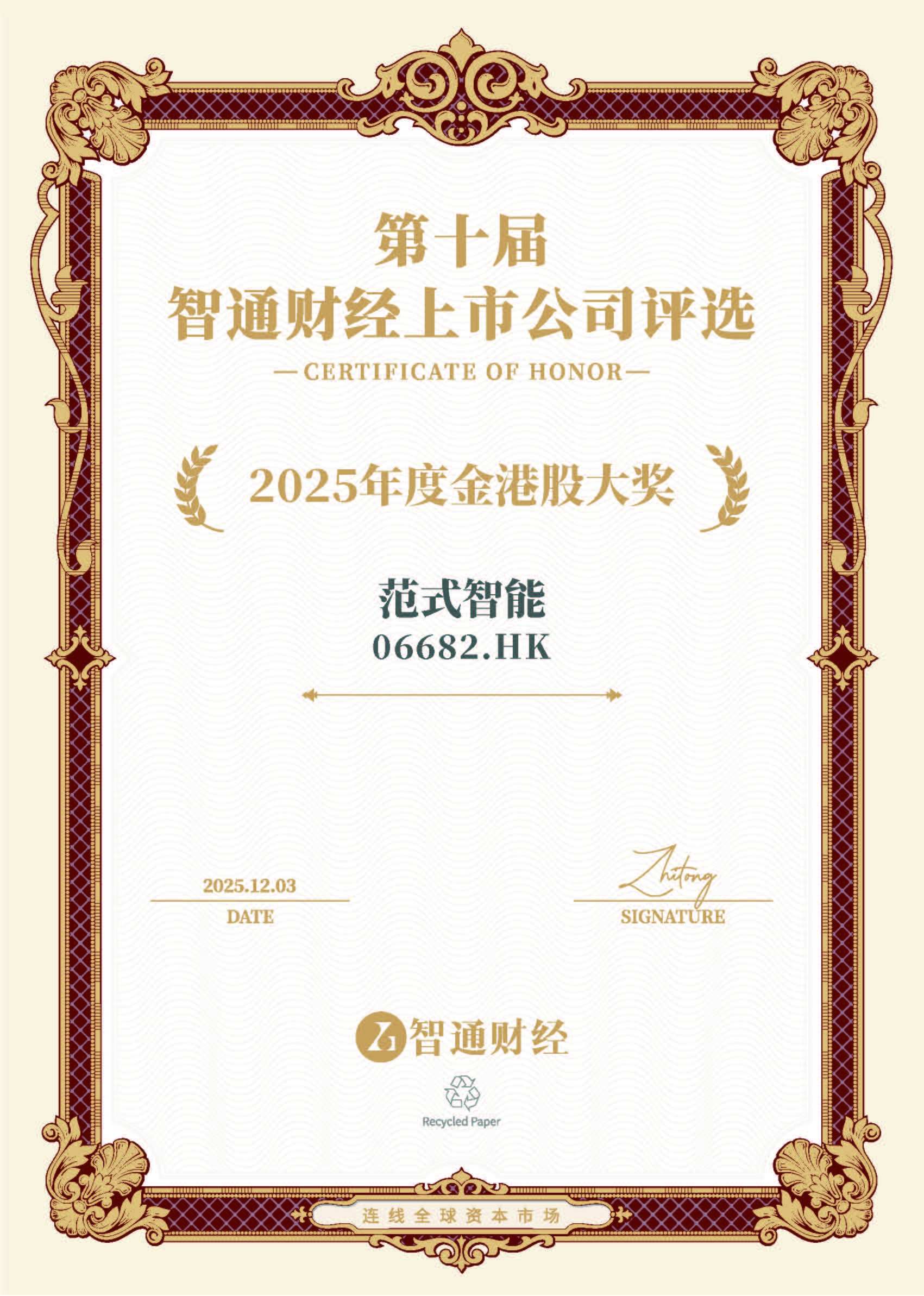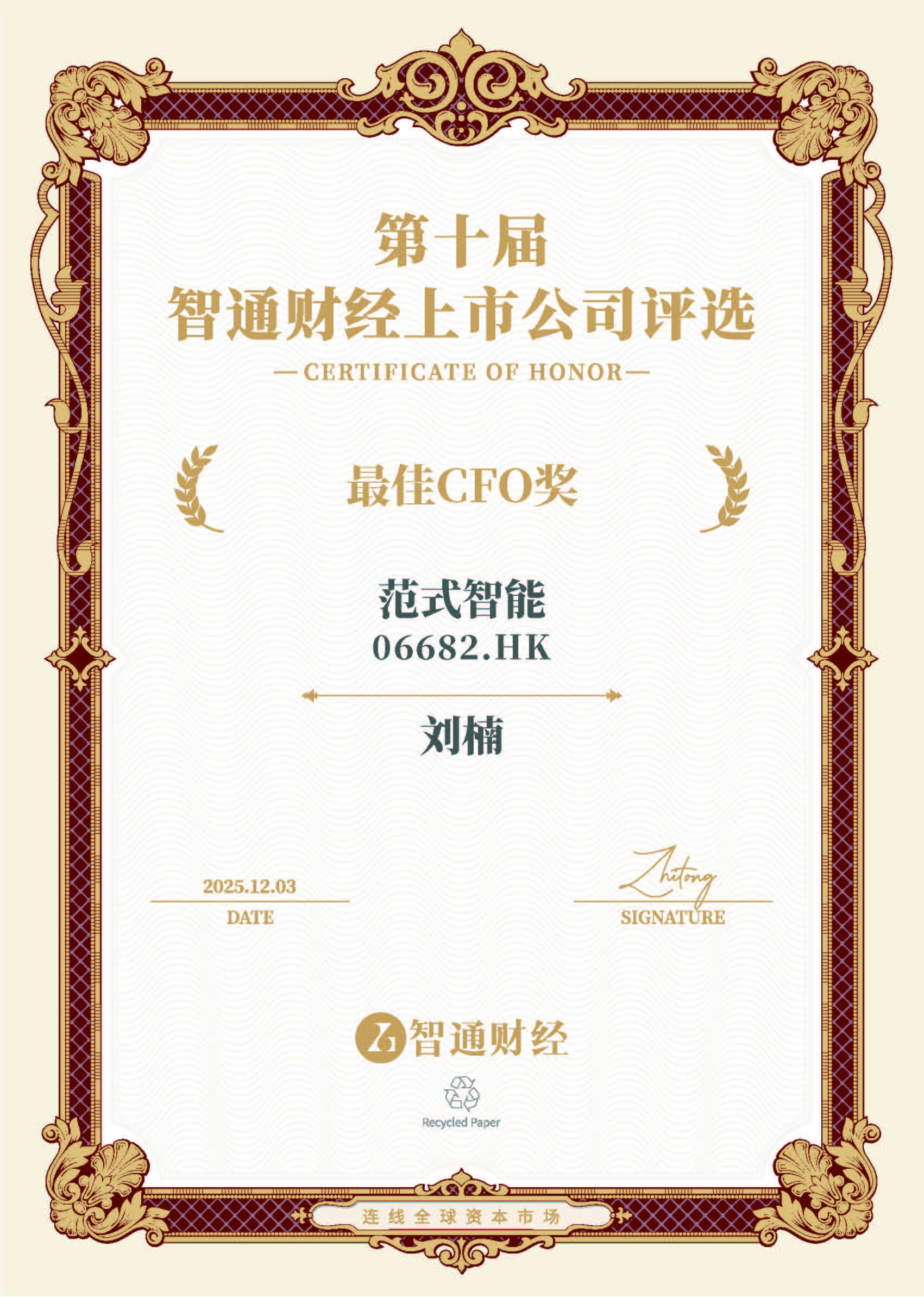 12月3日,在第十届智通财经上市公司颁奖盛典上,范式智能凭借卓越的经营表现、可持续的发展潜力及突出的综合实力,成功摘得“2025年度金港股大奖”,集团CFO刘楠获得“最佳CFO奖”。同期获得“金港股大奖”的有联想集团、百济神州、中信股份等各领域知名企业。