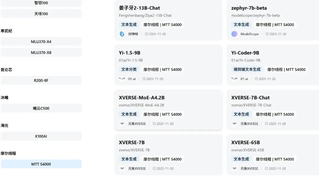 适配标签清晰直观:每个模型均标注可运行的芯片型号,支持用户快速匹配模型与算力。 -