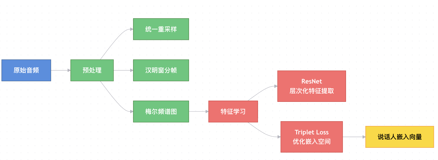 预处理与表征:系统对原始音频进行标准化处理,通过汉明窗分帧提取梅尔频谱图,将波形转化为包含丰富时频信息的特征矩阵。